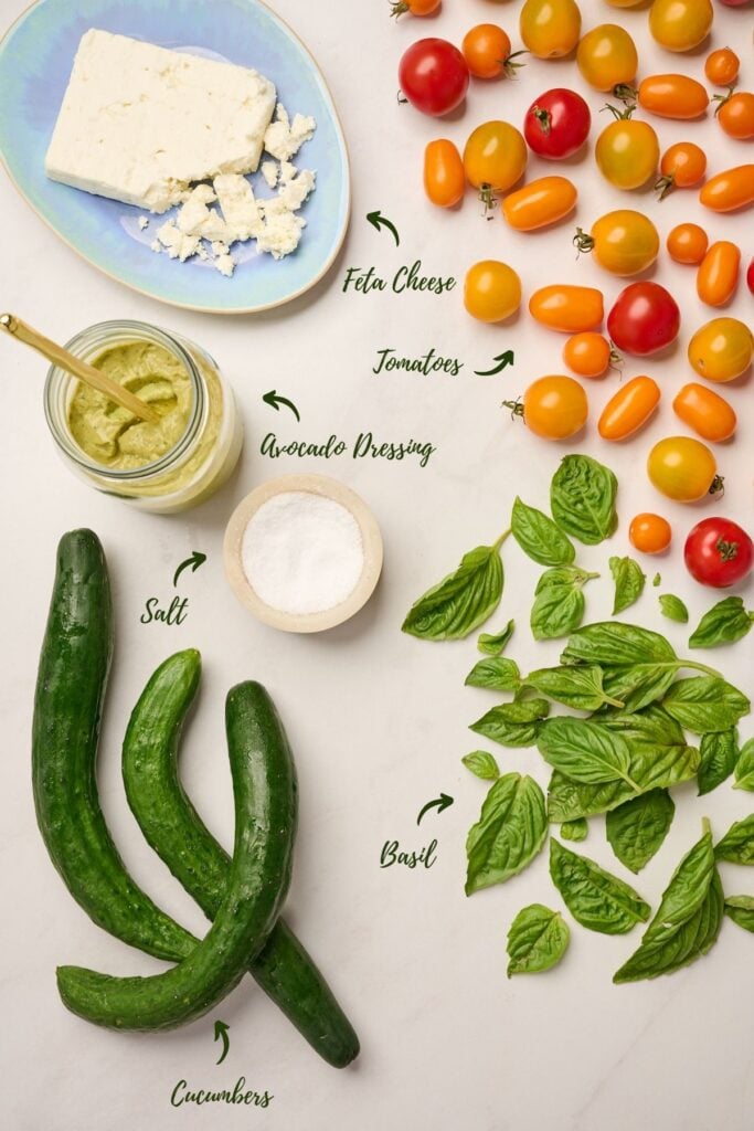 Chop and Prepare Ingredients: Cut and prepare your tomatoes (refer to how to cut tomatoes using the proper technique), cucumbers, and basil, and make the avocado dressing. Place all the chop veggies in a large bowl.
