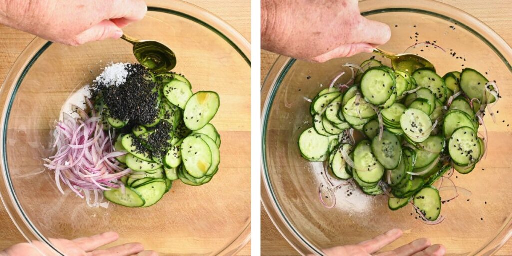 Add to a Bowl: Place the thin slices of cucumber and onion into a large bowl, and add the sesame oil, rice vinegar, black sesame seeds, and salt.