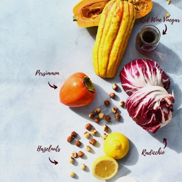 Radicchio: This adds a tart and bitter taste, which contrasts nicely with the sweet squash and persimmon, and it brightens the salad with a splash of color.