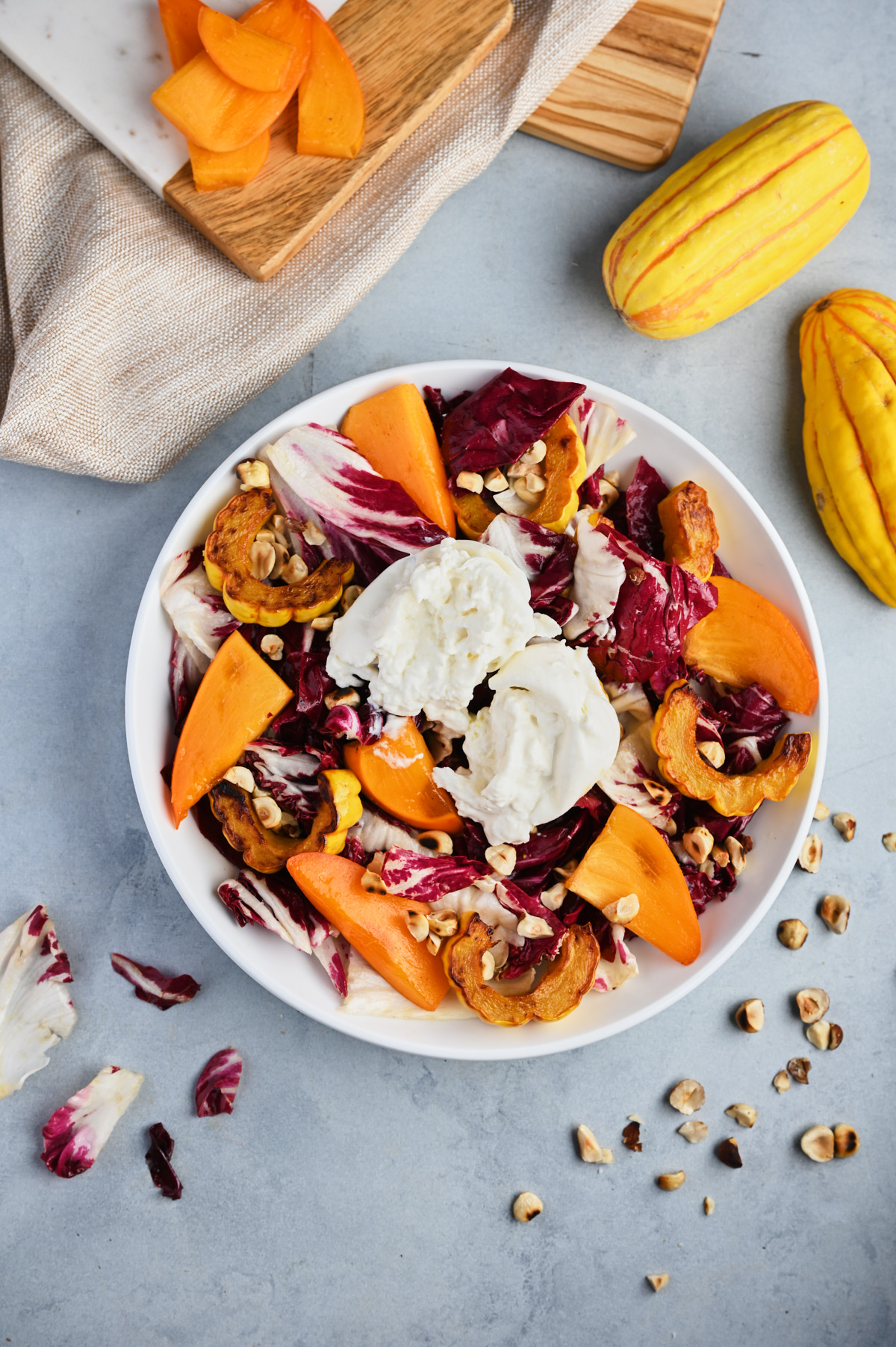 - Add seasoned radicchio to a serving bowl or platter, add the roasted squash, persimmons, and toasted hazelnuts, and place the burrata on top.